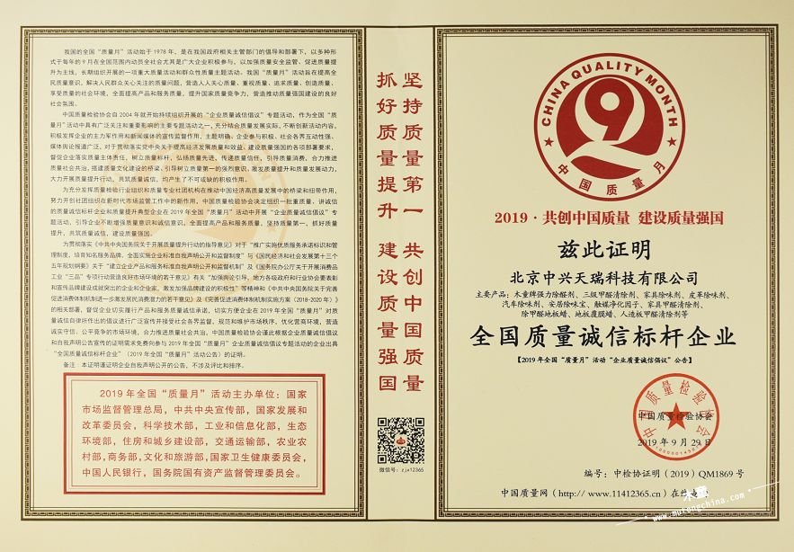 喜訊,近日我公司在2019年全國“質量月”活動中,被國家多家權威部門和質量檢驗協會評為2019年度“全國質量誠信標桿企業”。此次榮譽的獲得,是對木童產品和室內空氣污染凈化治理服務質量的充分肯定,我們也會以此為契機,積極履行質量安全主體責任,踐行質量誠信部署,在質量責任、質量安全、質量誠信、質量水平、質量發展、質量創新等方面起好示范帶頭作用。
