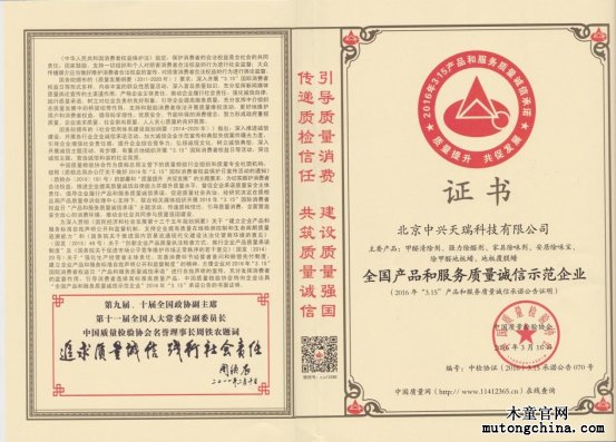 木童喜獲全國產品和服務質量誠信示范企業