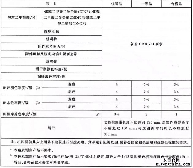1. 安全性:嬰幼兒產品的安全技術指標包括甲醛含量、pH值、異味、可分解致癌芳香胺染料、重金屬、鄰苯二甲酸酯、燃燒性能、銳利物、附件抗拉強力、可觸及銳利尖端和銳利邊緣、填充物、耐摩擦色牢度、耐唾液色牢度、耐汗漬色牢度、耐水色牢度、繩帶。標準中增加了產品不進行阻燃處理的建議,標準中優等品的耐汗漬色牢度、耐水色牢度指標比強制性國家標準提高了0.5級。