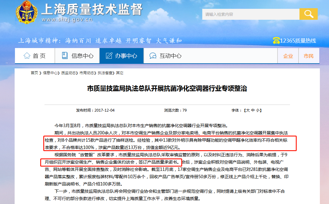 近日,上海法制日報從市質量技監局執法總隊獲悉,在總隊針對上海市生產銷售的抗菌凈化空調器行業為期5個月的專項整治中,發現“對外明示具有除甲醛功能的空調”不合格率達100%,涉案產品數量近13萬臺,貨值金額近9億元。截至11月底,海爾、奧克斯、國美、蘇寧等17家空調生產銷售企業及電商平臺,已對281款抗菌凈化空調器產品落實整改。
